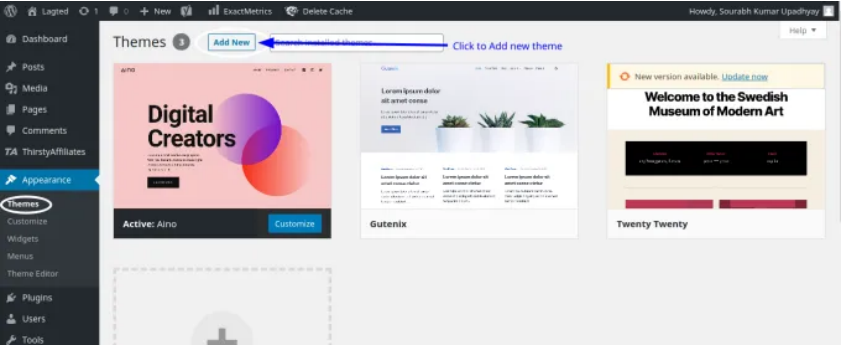 Typically, most themes come in a .Zip format, which you need to upload from your dashboard. But in this you do not need to do that, you just need to open your WordPress dashboard, go to Appearance then themes, you will see your installed themes, to add new theme select on add theme button.